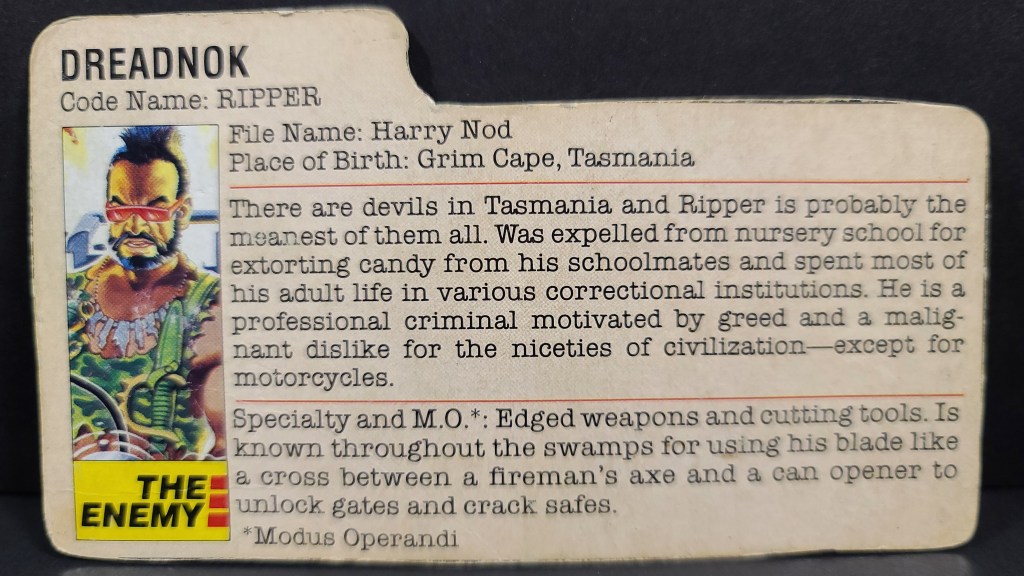 1985 Ripper – Dreadnok v1 HCC788 video review: Half the Battle video review: Photos: Share this: Click to share on X (Opens in new window) X Click to share on Facebook (Opens in new window) Facebook Click to share on LinkedIn (Opens in new window) LinkedIn Click to share on Reddit (Opens in new window) Reddit Click to share on Tumblr (Opens in new window) Tumblr Click to share on Pinterest (Opens in new window) Pinterest Click to email a link to a friend (Opens in new window) Email Like Loading...