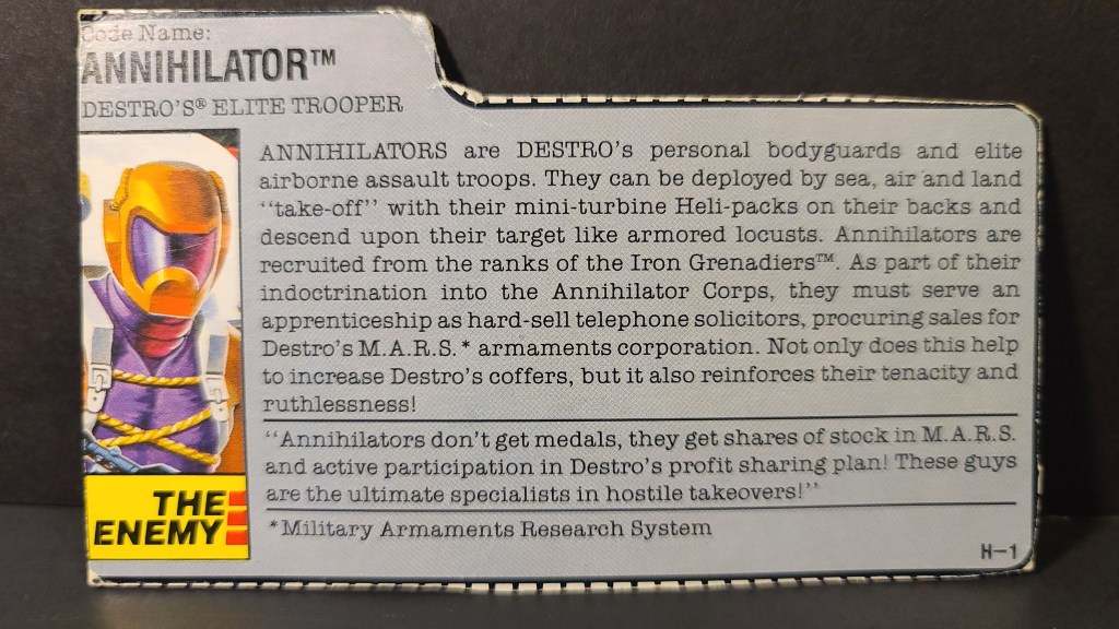 1989 Annihilator -Destro’s Elite Trooper v1 HCC788 video review: Half the Battle video review: Photos: Other videos: . Share this: Click to share on X (Opens in new window) X Click to share on Facebook (Opens in new window) Facebook Click to share on LinkedIn (Opens in new window) LinkedIn Click to share on Reddit (Opens in new window) Reddit Click to share on Tumblr (Opens in new window) Tumblr Click to share on Pinterest (Opens in new window) Pinterest Click to email a link to a friend (Opens in new window) Email Like Loading...